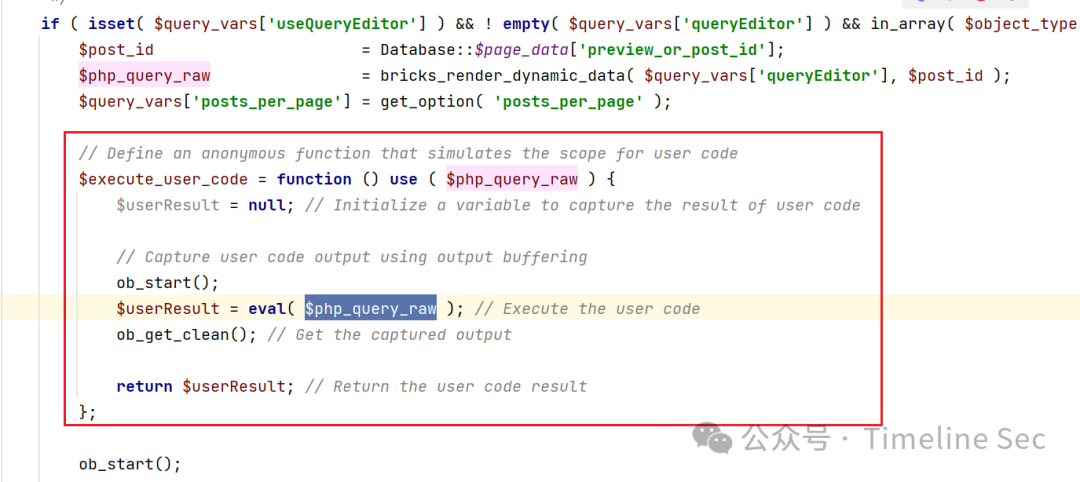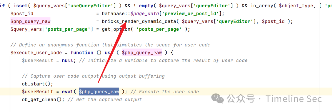$php_query_raw由bricks_render_dynamic_data( $query_vars[‘queryEditor’], $post_id );得到,bricks_render_dynamic_data函数用来执行数据渲染操作,而$query_vars[‘queryEditor’] 是一个存储动态数据配置的数组,该数组包含了查询参数和条件。$post_id 是当前页面或发布的 ID,用于指定要渲染动态数据的特定页面或发布。