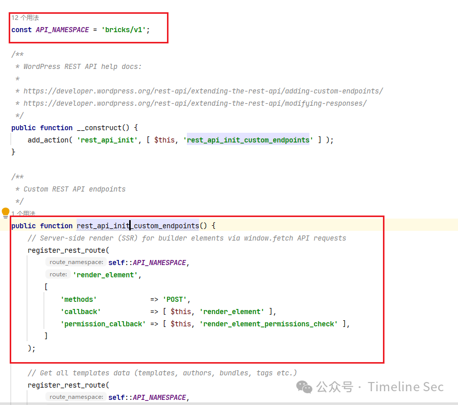 继续搜索调用,找到在它的自定义初始化端点函数,从中可以看到它定义了很多能够注册的REST路由,API_NAMESPACE的值就是/bricks/v1/,通过后面拼接某个字符串的方式触发对应的callback回调函数以及权限检查。