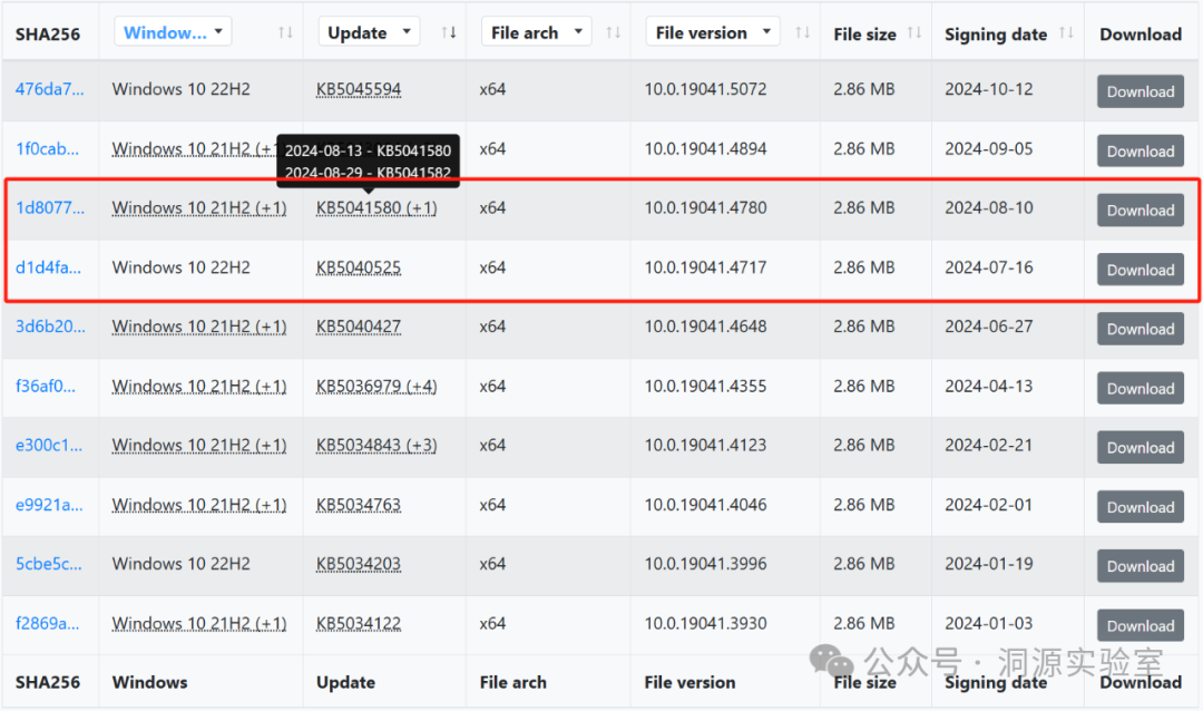 笔者使用的是Windows 10专业版22H2版本的系统进行文件对比和分析,因此在Winbindex中寻找补丁发布(2024年8月13日)前后该版本操作系统的tcpip.sys文件。
