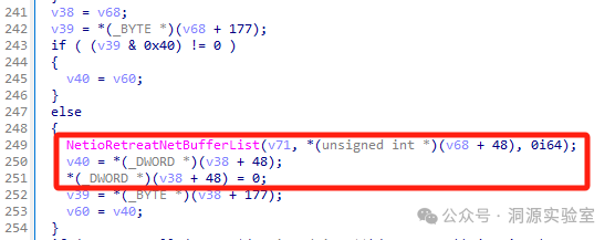 在IppSendError函数的伪代码中可以看到多次调用NetioRetreatNetBufferList函数,该函数是用来撤回网络缓冲区重新传输或丢弃数据包用的,或者说是用来处理错误信息的必要函数,既然是整数溢出漏洞,那么就需要特别关注下NetioRetreatNetBufferList上下文的部分,其中尤为可疑的部分是下图中的代码。