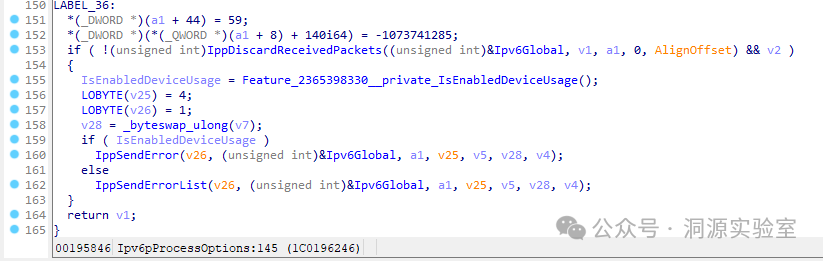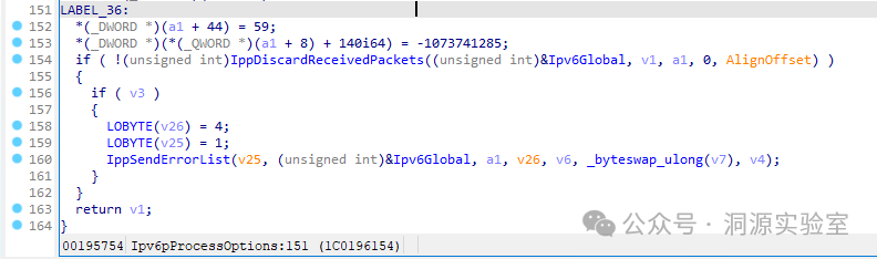 而补丁修改的代码是删除了IppSendErrorList函数直接调用IppSendError函数,也就是说补丁的核心功能是去掉了链表遍历。这是两个完全不同逻辑的处理方式,前者是通过链表处理每个节点,后者则是只处理一个节点,上述代码的入参a1同时也是Ipv6pProcessOptions函数的入参,这个参数其实是NET_BUFFER_LIST结构的网络包的列表,更新后的补丁只处理第一个节点,也意味着漏洞的成因是由于链表的处理。