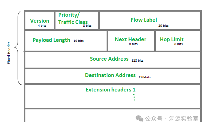 Length)、下一个报头(Next Header)、跳数限制(Hop Limit)、源地址(Source Address)、目的地址(Dstination Address),第二部分是扩展报头(Extension Header),其长度不固定,但内容包括逐跳选项(Hop-by-Hop Options)、目的地选项(Destination