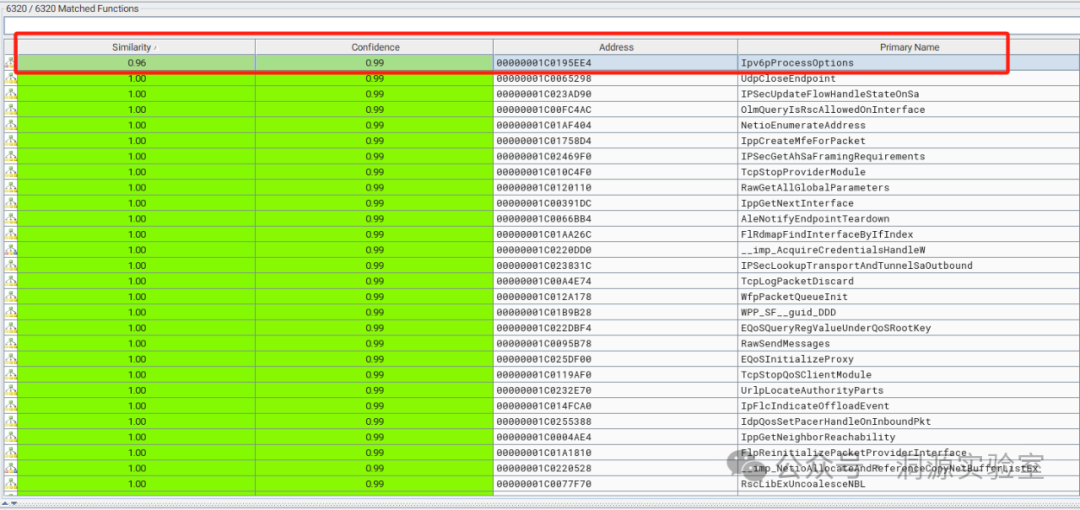 在匹配函数(Matched Functions)功能中可以看到这两个文件唯一的区别是来自Ipv6pProcessOptions函数,根据函数名称可知该函数在Windows系统中是用来处理IPv6数据包选项信息的。