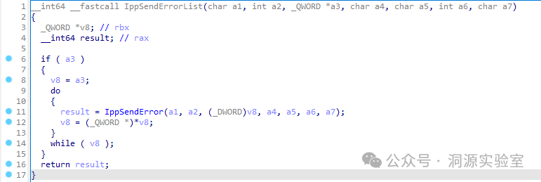 接着查看IppSendErrorList函数(如下图),这个函数中定义了一个临时的指针变量v8,同时结合通过遍历传入的指针参数a3,实现IppSendError函数对于指针*a3的遍历调用,即使用函数IppSendError处理链表中的节点。