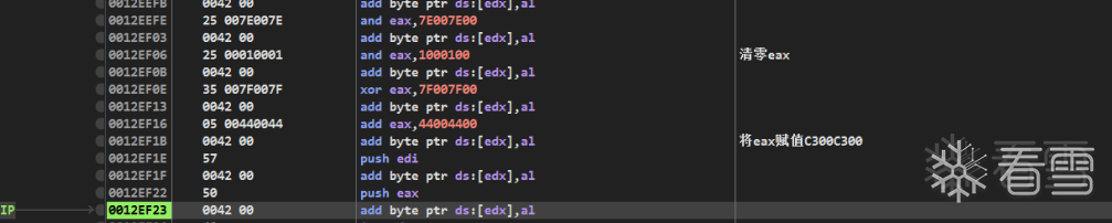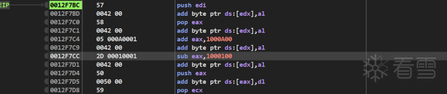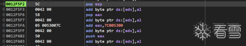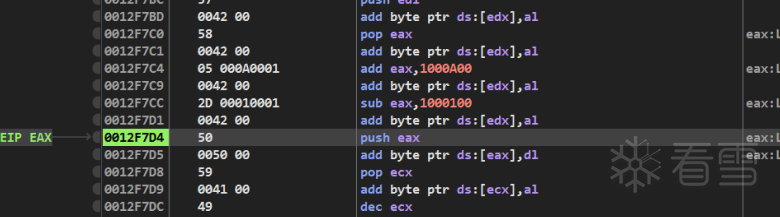 这里预先存放了0x0032007B。接着一顿操作将eax变为7C32537B后压入栈: