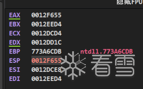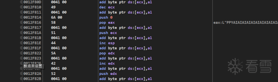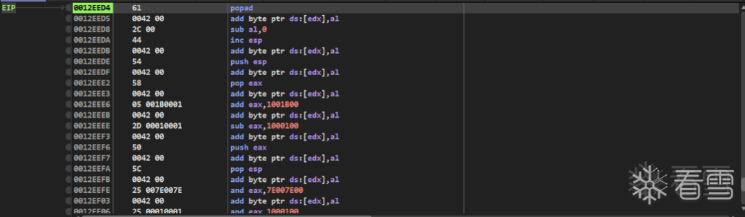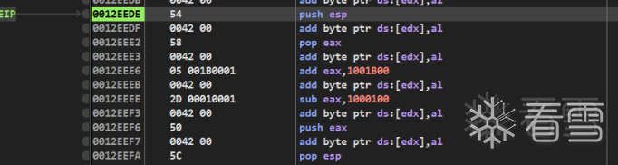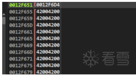 可以看到此区块的作用是将0012F651地址中的0012EED4取出给eax,再将eax提升到0012F6D4后压入栈: