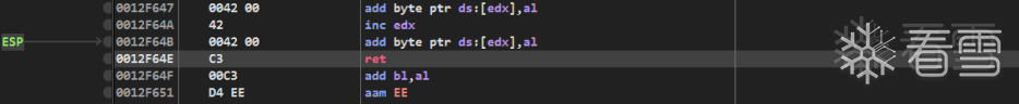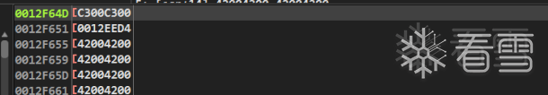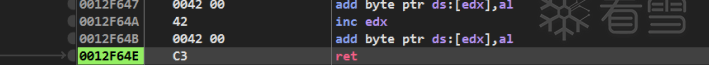 将0012EED4写入0012F651地址msf的解释是为了对齐堆栈。我们暂且不管这个操作,接着将C300C300写入0012F64D这个地址,貌似上面一切改变esp的操作都是为了让我们将 C300C300写入00126F4D这个地址。根据上面解释0xc3代表ret指令。我们在汇编窗口查看0012F64D+1这个地址,可以看到此汇编指令变成了ret。