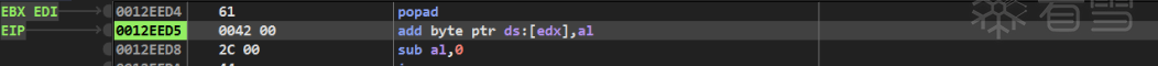 正好跳转到我们的覆盖的SEH结构上,0x61为popad,执行后提高了我们的esp 同时注意此时的edi为0012EED4。