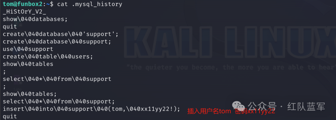 查看.mysql_history,这个文件纪录关于数据库的历史命令