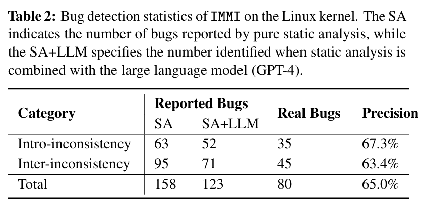 只要完成了上述的分析,寻找bug的基本要素都齐备了,最后就只需要进行关联分析——把caller和callee关联起来检查有没有IMMI的情况存在。这个分析的最大特色之一就是它的运行效率非常高,对整个内核的分析时间竟然只要不到40分钟就搞定了(要知道分析的机器也就只有一颗Xeon Silver 4316 CPU)