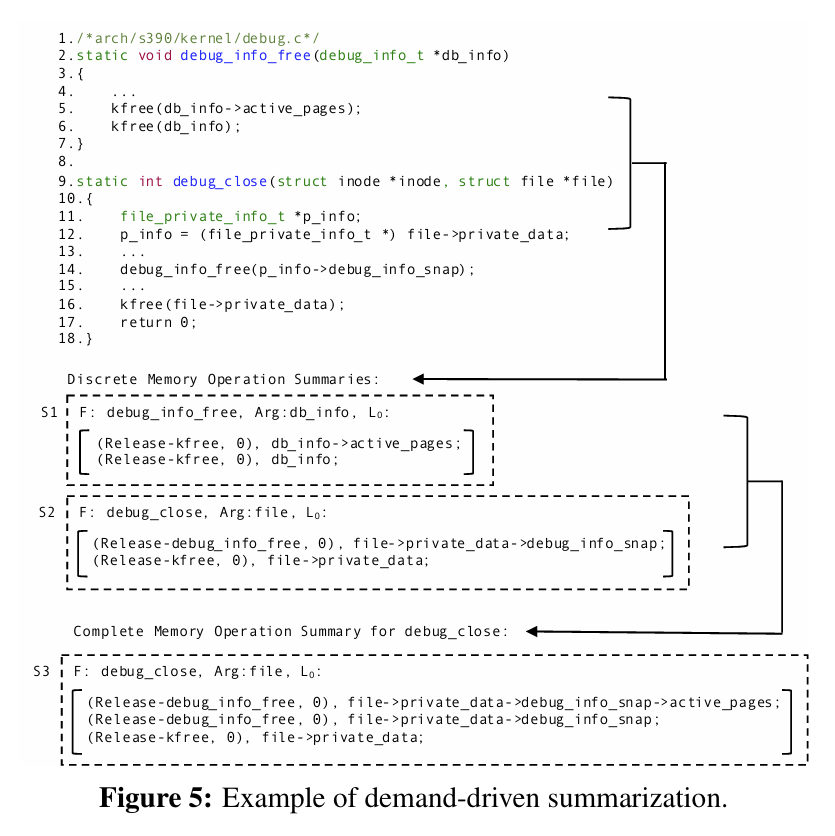 上面这个流程的第一步,如果大家参加过2023年的Let’s GoSSIP暑期学校,听过卢康杰老师的课程,就肯定不会陌生。这里就是很标准的把(Linux内核)代码编译成LLVM IR(bitcode)形式并且进行一些基本的分析(比如alias analysis)的过程,我们就略过。整个分析过程最关键的是上图的中间部分(MM Intention Inference),在这一步中,作者首先要给内存管理操作进行总结(summarization),这个和G.O.S.S.I.P在2022年的工作Goshawk是类似的,不过本文作者觉得Goshawk提出的那个MOS概念都太复杂了,他们用了一个更加简单的总结方式(下图所示是一个实例),也就是从最基本的一些内存管理函数(kfree这种)出发,然后逐步去寻找更上层的封装函数。仔细看一下就会发现,这个总结方式关注的是一个特定的内存管理函数(MM function)内部怎么去处理(分配和释放)内存对象的,没有把它和函数参数关联起来,这个可能是它和Goshawk工作里面的MOS概念的一个大的区别。具体的实现细节,大家可以看论文的4.2章。