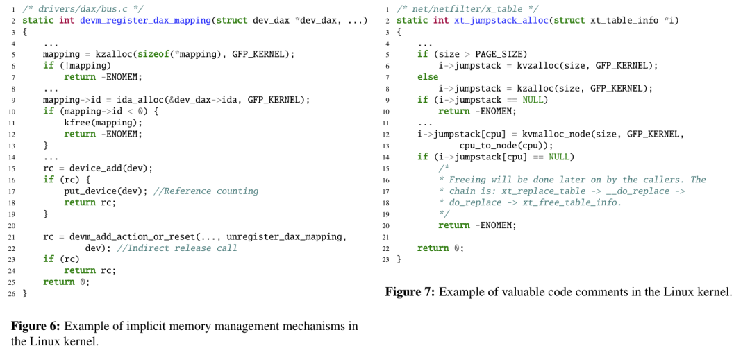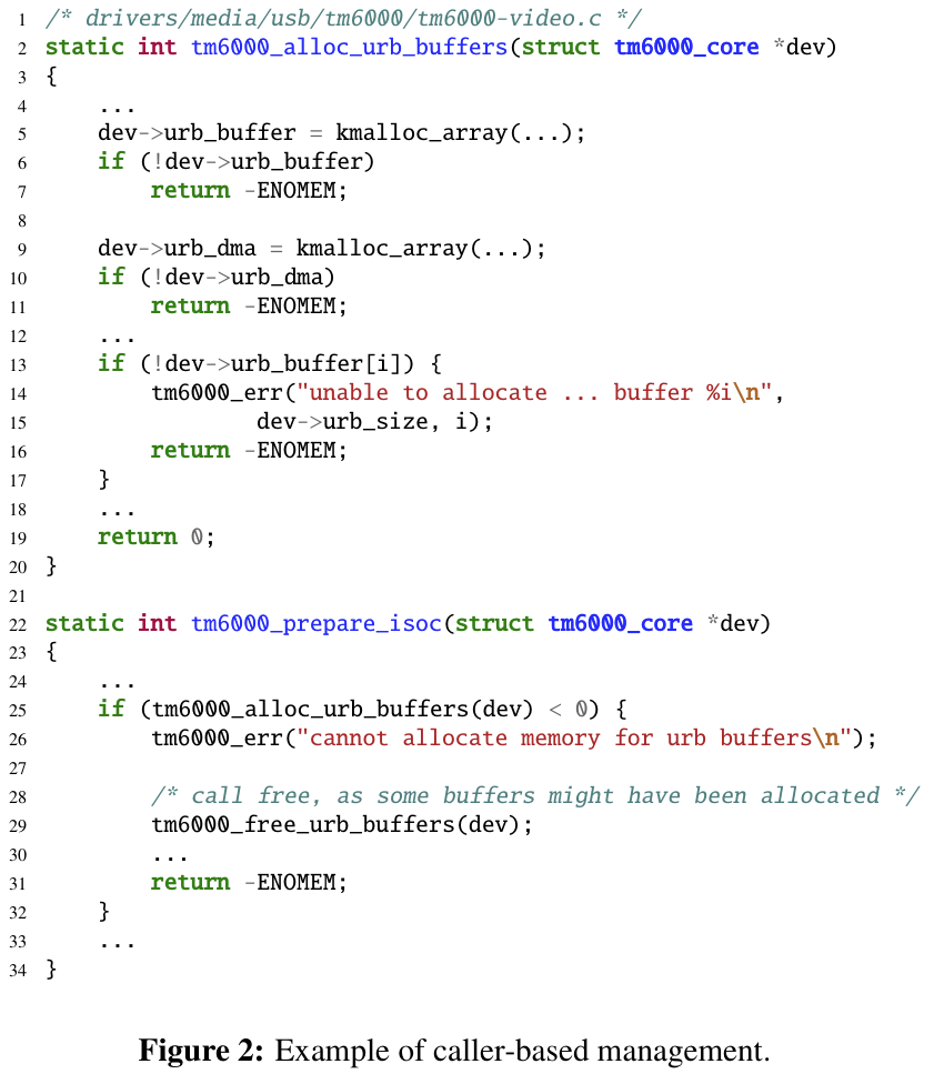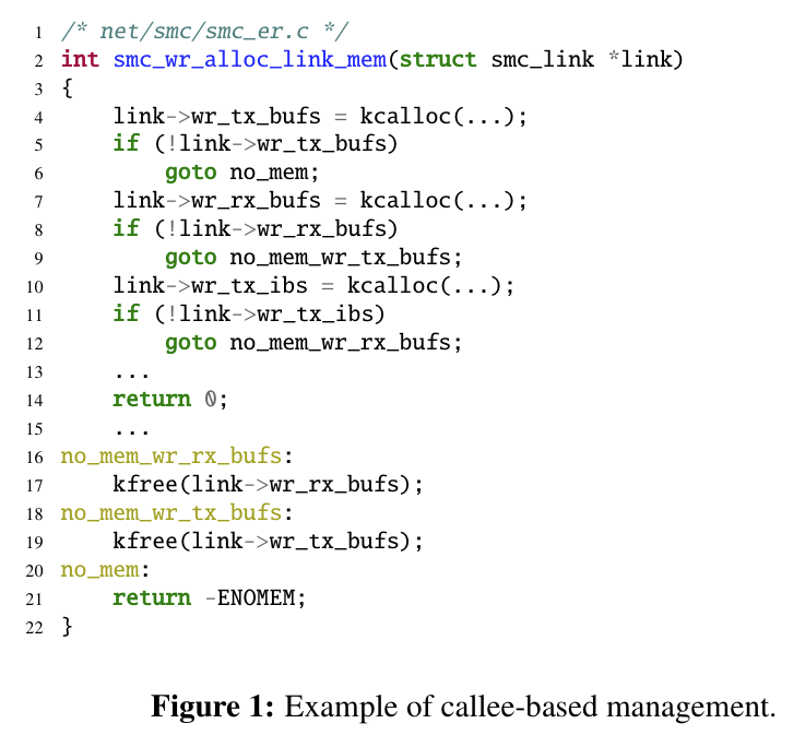在这篇论文中,作者总结了一个叫做inconsistent memory management intentions(IMMI)的概念,理解了这个概念,你就理解了本文最关键的思想。让我们先回到最基本的(Linux内核)内存管理实现中去,看两个基本的编程策略。在现实中,内存分配需要考虑的out of memory的情况,如果没有分配到需要的资源,就需要进入到异常处理分支,但是谁来负责这个收尾工作?我们观察到通常是有两种策略:一种叫做callee-based management,也就是在(被调用的)内存管理函数内部进行善后工作;一种叫做caller-based management,这种情况下内存管理函数只返回一个信息说“我失败了”,其它事情交给调用者去处理。下面的两份代码示例可以让我们更好理解这两种情况: