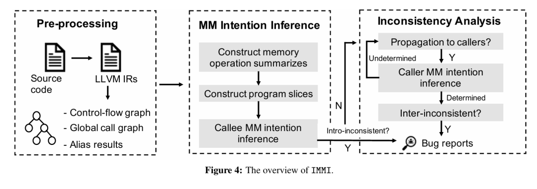 如果能够有效地追踪上面提到的这些IMMI,那么我们可以期待找到许多新问题,而且这个方法的一个非常有吸引力的特点是它相对于其他的分析工作来说开销是比较小的,因为只需要考虑内存管理函数和调用者之间的关系。但是要实现整套分析,里面需要解决的问题还是蛮多的,作者设计了如下的工作流程,让我们去解读一下: