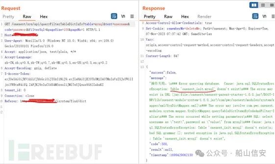 table参数带入mysql表查询,返回的错误信息表onenext_init.mysql不存在,暴露了当前库名为onenext_init,在已知表字段的情况下,能查询onenext_init库中所有表的信息。