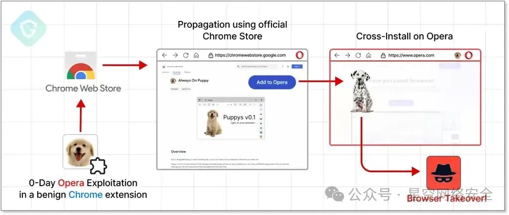 Chrome 商店中的 Puppy 主题扩展程序跨越 Opera 界限并利用了 0-Day 漏洞 | 图片来源:Guardio Labs