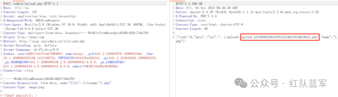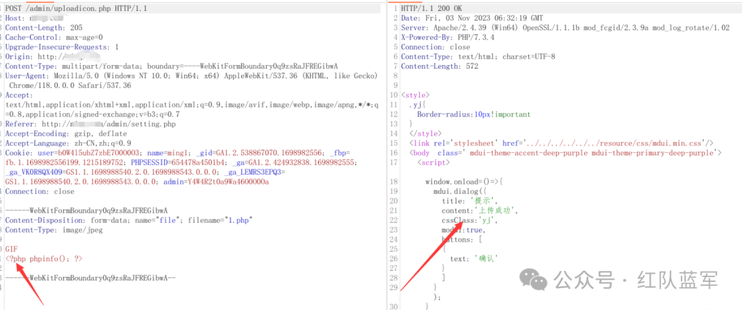 可以看到没有做过的校验和限制,这时候使用burp抓包之后,修改上传的后缀即可。