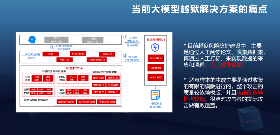 对于上面那些难点,许多厂商都给出了相关的解决方案。我们再看一下目前来说个大部分厂商提供的一些解决方案,不同的厂家直接的区别可能更多的是恶意样本库,Prompt攻击模版、还有测试集。但是是这形式会有两个问题点。第一个问题点就是目前大语言模型这些case收集的成本高。无论是测评数据集还是prompt模版,都需要人工去打标筛选,许多prompt模版甚至需要去仔细阅读论文,整个收集过程人工成本较高。第二个问题点就是攻击多样性低,就是恶意样本它们的生成都是通过有限模板进行简单的变异得来的,它和我们实际攻击者的攻击流程会有很大的区别,所以它攻击多样性也比较低,覆盖率比较低。