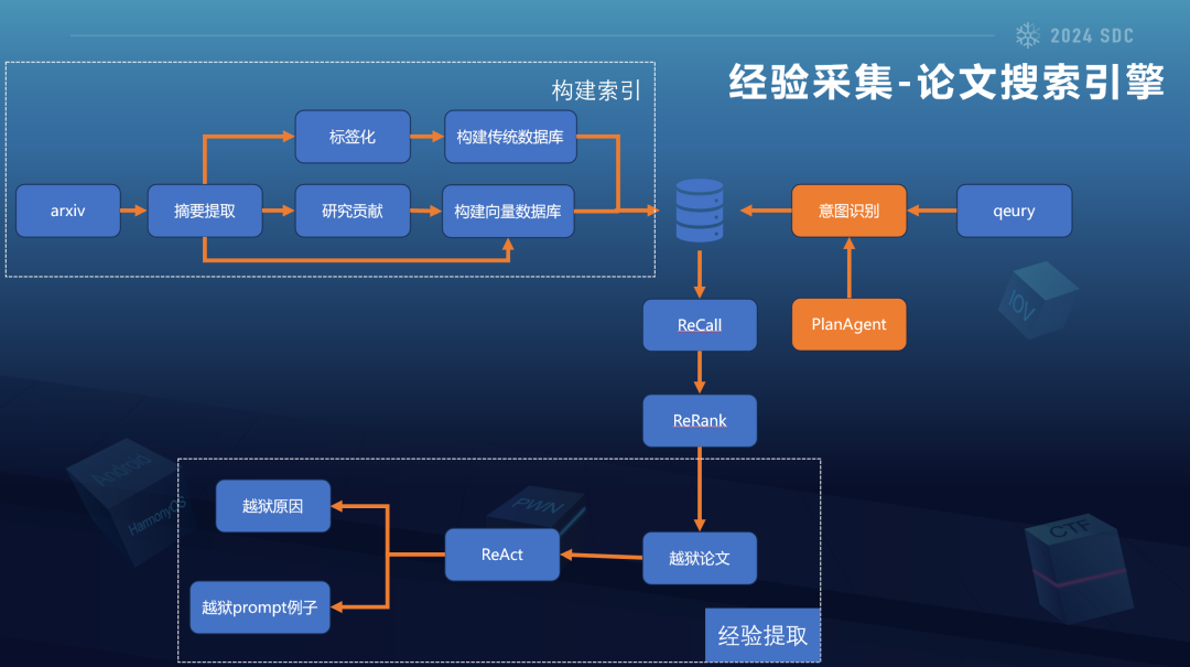 意图识别:为了应对可能的论文查询,我此处使用了PlanAgent,目的是让Agent将用户的查询转化为搜索的行为序列。例如,本周更新的越狱方法有哪些?它会生成时间为本周、类型为大模型攻击的sql查询,然后再生成越狱方法的向量查询。