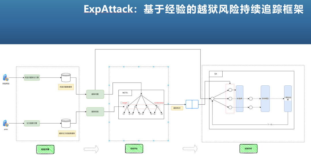 为此,我们提出了ExpAttack大语言模型越狱风险持续追踪框架。该框架主要分为三大部分:经验采集、经验评估和经验利用。在经验采集阶段,又细分为两个模块:风险问题转化引擎和论文搜索引擎,这一部分主要通过工程化的手段来进行情报收集。经验评估部分,我们采用了大语言模型增强的强化学习算法,对收集的经验进行评估。最后,在经验利用阶段,我们引入了遗传算法,这一算法之前在字节SRC中做过展示。