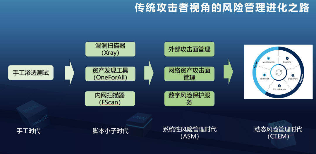 面对这么复杂情况,我们传统安全是怎么解决呢?我们可以通过上图看见传统安全的建设流程,从最开始的时候都是一个漏洞一个漏洞进行手工测试,很快大家可能就会意识到,我们是不是可以开发一个工具对这些漏洞进行自动化扫描、利用,就像Xray、Fscan等。再后来将这些攻击工具进行系统性的分类组合,就实现了攻击面管理。再后来,发现整个攻击面管理主要是在识别攻击面上,没有实现安全风险的闭环。接着就提出了持续威胁暴露管理来动态、持续性的闭环管理安全风险。