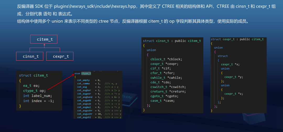 ctree 由 cexpr_t 和 cinsn_t 组成,可以通过 op判断 citem_t 的具体类型,然后根据类型的定义获取每个语法树节点的操作数。