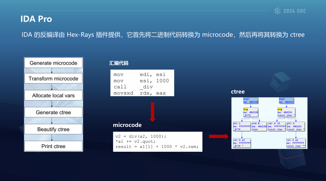 它首先将汇编指令转换为它的中间语言(microcode),然后然后再在microcode上面做一些反编译的算法,然后最终会生成ctree,即IDA的语法树。