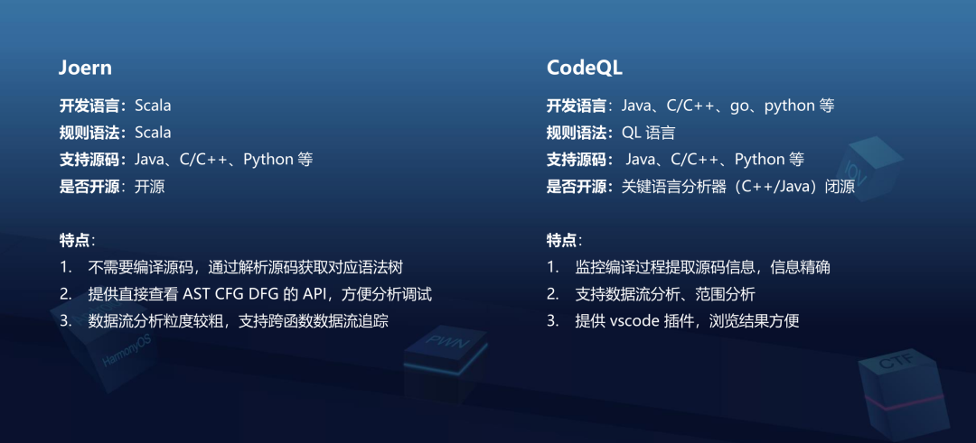 面临的第二个难点是同类问题排查,目前针对二进制目标缺乏自动化分析工具,可以去批量的去排查类似问题。但这种情况的话在源码领域却是不一样的,它有很多类似的工具可以用,比如 codeql、Joern、Fortify 等。