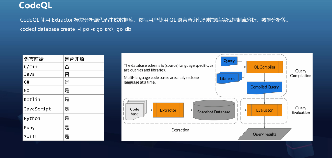 目前核心 Extractor (C/Java)闭源,其他的提取器是开源的,通过分析这些开源的提取器可以了解 CodeQL 的一些技术细节,其工作流程如下: