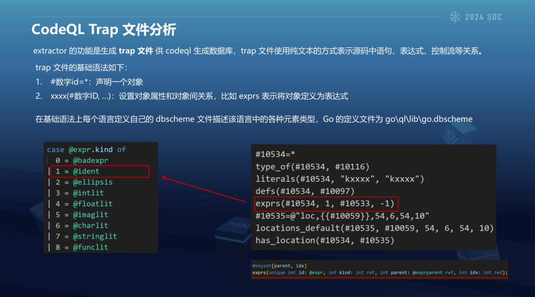 如果要让 CodeQL 支持一个新语言或者新格式最重要的就是生成对应的 trap 文件, trap 的文件格式如下: