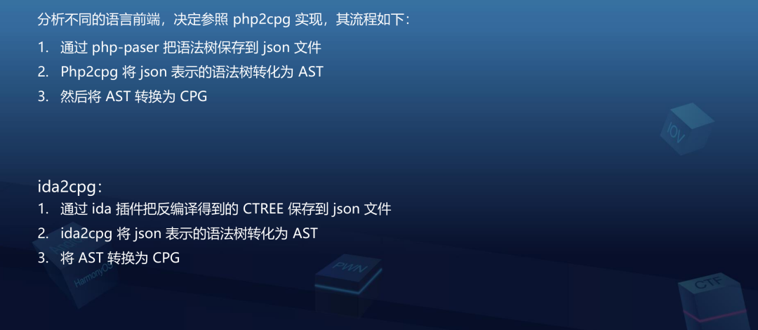 完成对 Joern 实现原理的分析后,就要考虑如何进行开发,我们目前有Json表示的语法树,php2cpg 模块正好也是以 Json 为输入,于是基于 php2cpg 实现开发,降低工作量。