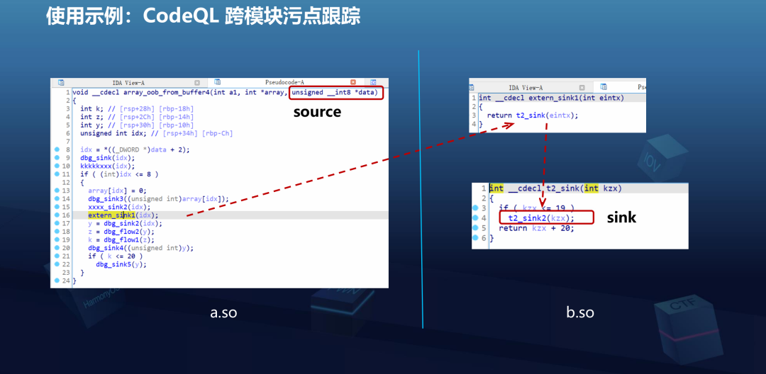 图中是一个跨二进制数据流的场景,使用编译好的 ida2codeql 分析二进制并生成数据库。