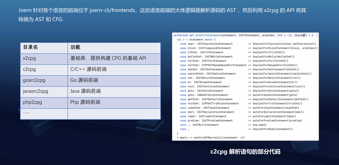 其中 x2cpg 是基础库,提供构建CPG 的基础 API,其他模块就是根据不同语言的语法树结构调用 x2cpg 生成 CPG。