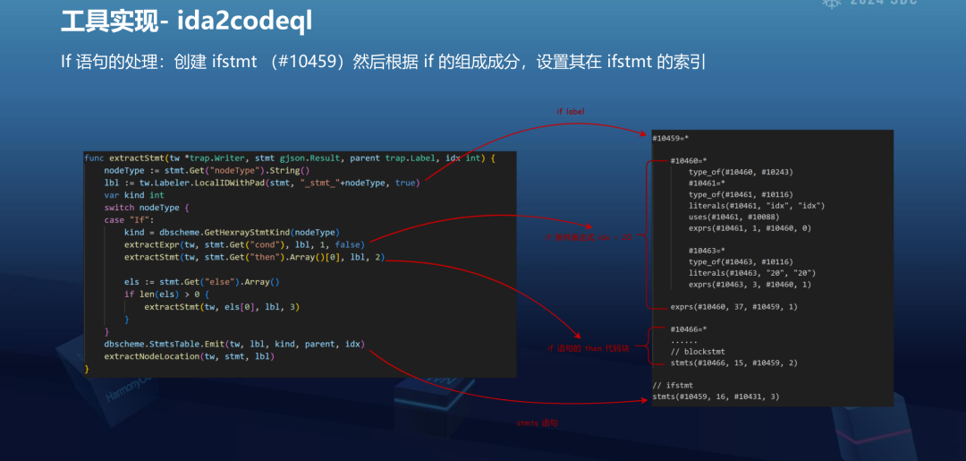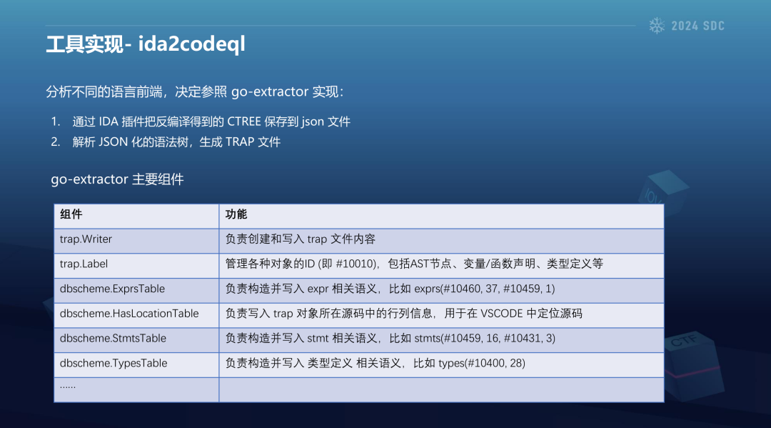 其他类型的语法元素也是类似的表示,详细可见议题材料,在分析 CodeQL 表示程序的语法和格式后就可以进行具体的代码开发,为了降低工作量,决定基于一个现有的提取器开发 IDA 反编译信息分析工具,最终是基于 go 语言的提取器完成开发。