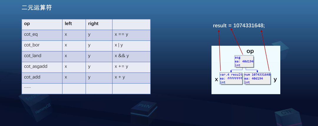 以二元运算符为例,通过 op 的值确定二元运算符的类型, x是左成员,y是右成员,右图是一个实例,它的x是 result,然后y的话是一个number,它是一个立即数。