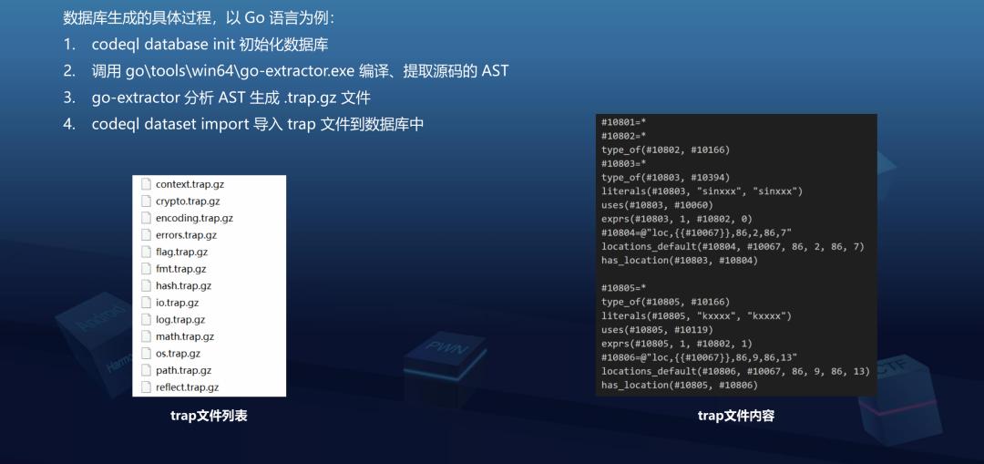 CodeQL 通过 Extractor模块提取源码信息到 trap 文件,最后将其转换为代码数据库。