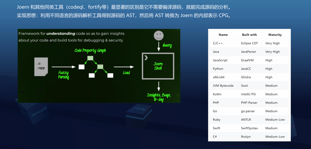 它使用不同的工具分析源码,提权源码的语法树,然后基于语法树构建 CFG、DDG 等,生成 CPG,之后用户可以编写规则对 CPG 进行分析。