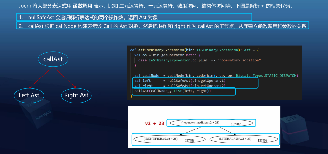 Joern 在实现层面的特点是将所有的指令转换为函数调用,比如 + 运算符就会通过 .addition函数调用表示。