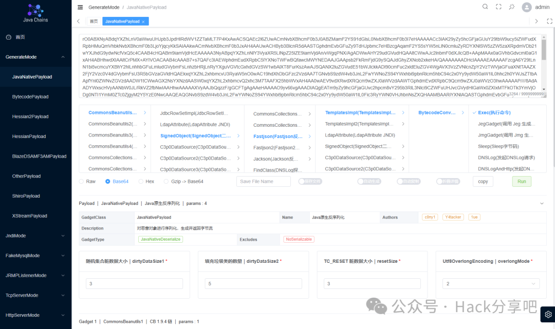 Web版 Java Payload 生成与漏洞利用工具,提供 Java 反序列化、Hessian 1/2 反序列化等 Payload 生成,以及 JNDI Exploit、Fake Mysql Exploit、JRMPListener 等相关利用。