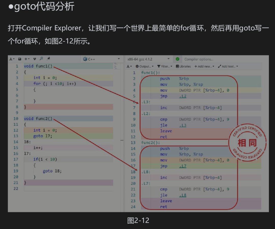 让我印象最深刻的时候,是看 goto 和 for 的区别,这在C语言中是两个不同的指令,但在汇编层次,我们用 goto 构造指定的代码,然后到了CPU验证,汇编指令是没有任何区别的。