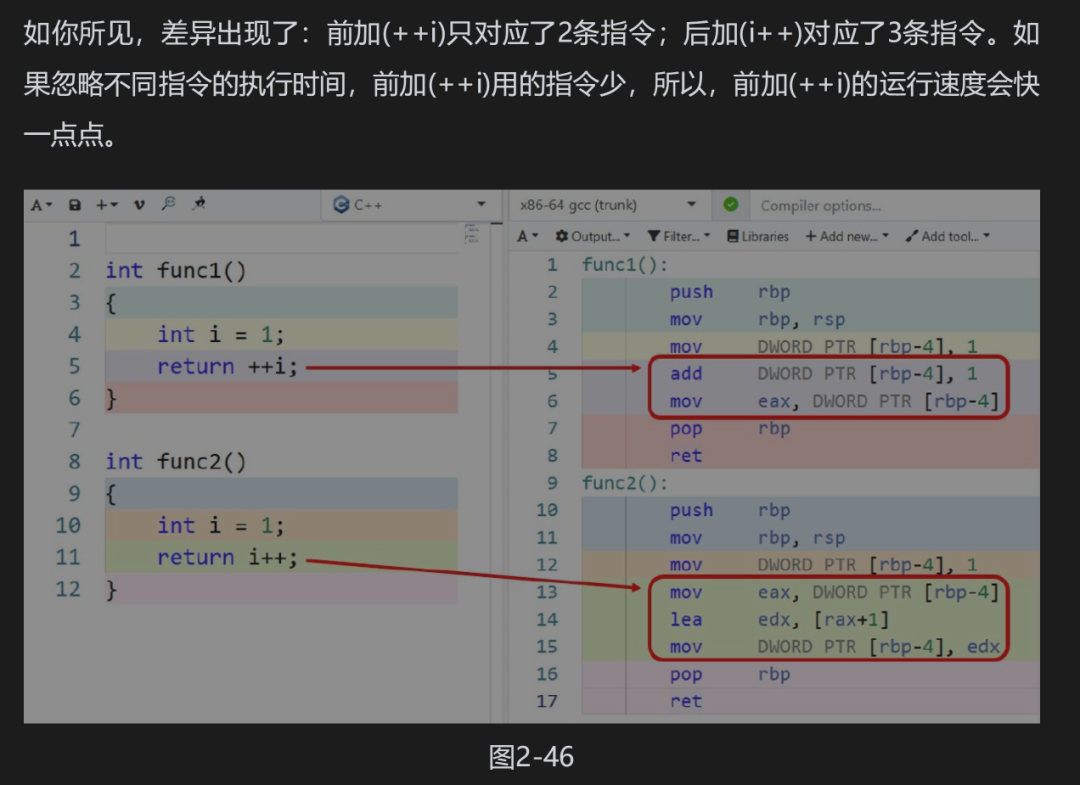 还有就是 i++ 和 ++i 的区别。如果是在大学学过C语言,参加过考试的,一定会见过对这两种区别的考核,问最后的结果是多少。从C语言上看,可能不明所以,但到了汇编,具体过程就一目了然。