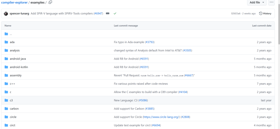 案例:下面都是支持的语言https://github.com/compiler-explorer/compiler-explorer/tree/main/examples