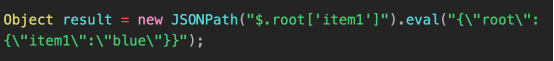 JSONPath.eval(“{\”root\”:{\”item1\”:\”blue\”}}”, “$.root[‘item1’]”);