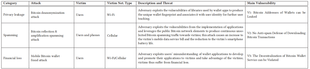 通过利用这些漏洞,本研究设计了三种针对用户的PoC:(1)比特币去匿名攻击;(2)比特币反射和放大垃圾信息攻击;(3)比特币钱包欺诈攻击。第一种攻击使攻击者可以取消对比特币钱包使用的非真实比特币地址进行匿名处理。此攻击不仅以低错误率(例如10^(-13)%)识别比特币钱包App用户的所有比特币地址,而且还可以在满足某些使用条件的同时发现应用程序用户的真实身份。在第二种攻击中,攻击者利用中间的公共比特币网络元素(例如,全节点客户端)向比特币钱包App用户连续不断地未经请求地发送垃圾信息。垃圾信息流量由攻击期间全球所有比特币用户产生的所有新比特币交易组成。这是一种低成本的攻击;攻击者只需要向比特币网络发送一些小的发起数据包。在实验中观察到放大系数(垃圾信息流量大小与攻击发起包大小之比)接近3,666。这种攻击以两种方式攻击受害者:(1)在使用蜂窝网络服务时,受害者需要为比特币垃圾消息付费;(2)受害者的手机比未受到攻击的手机消耗更多的电能96%。第三种攻击显示了攻击者为何可以超越其他类型的金融移动程序攻击的限制,针对比特币钱包应用程序用户发起各种比特币欺诈攻击,下表总结了本文发现。