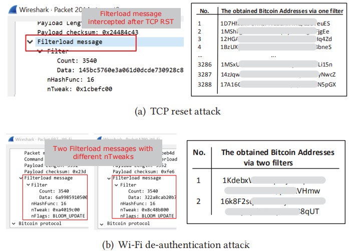 2)对受害设备发起了Wi-Fi取消身份验证攻击,并获得了来自不同nTweaks的多个过滤器。首先,将Aircrack-ng部署在Linux计算机上,并将无线网络适配器卡更改为监视模式,该卡允许该卡发现附近的Wi-Fi路由器及其MAC地址和SSID(Wi-Fi的服务集标识符)路由器,例如“Starbucks WiFi”)。其次,执行命令“ airplay-ng –deauth 0 -c XX:XX:XX:EC:3B:30 -a XX:XX:XX:36:92:10 wlp3s0mon”,其中EC:3B:30和36:92:10是用户设备和WiFi路由器的MAC地址的最后三个字节,而wlp3s0mon是无线网络适配器卡。第三,经过5秒的攻击期后,停止了攻击。断开连接的受害设备将在不到10秒的时间内重新连接到Wi-Fi路由器,并传输由新的nTweak生成的filterload消息。通过重复步骤2和3,攻击者可以获得多个filterload消息并标识SPV客户端使用的比特币地址。
