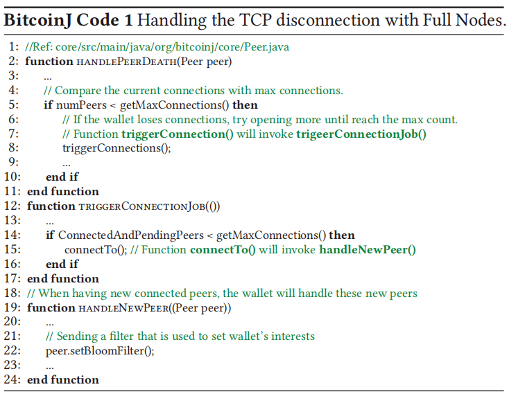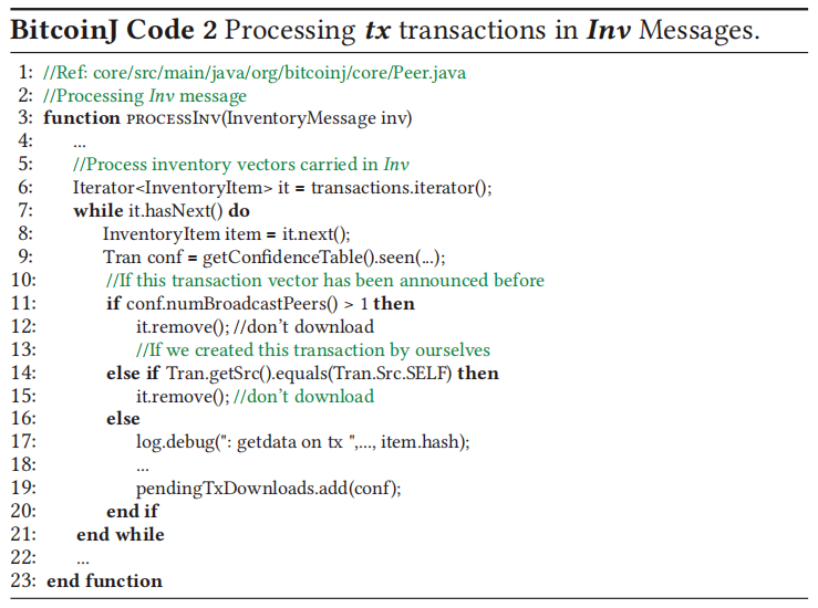 研究表明,BitcoinJ将在下载inv消息之前对所有交易进行检查。但是,检查是有缺陷的,如BitcoinJ code2所示。具体地说,进行了两次检查:(1)是否在(第11行)之前未下载交易,以及(2)交易是否不是自发的(第14行)。如果无论哪种情况都不进行交易,BitcoinJ将下载比特币交易(第19行)。这证实了BitcoinJ在下载交易之前不检查正在下载的比特币交易是否可以通过发送给FNC的先前过滤器。如果在BitcoinJ上没有部署其他安全机制(例如,与恶意FNC断开连接),则SPV客户端将下载接收到的inv消息中指定的比特币交易操作,无论这些交易是否出于其目的。因此,SPV客户端用户会遭受各种攻击,并且没有意识到这些攻击。