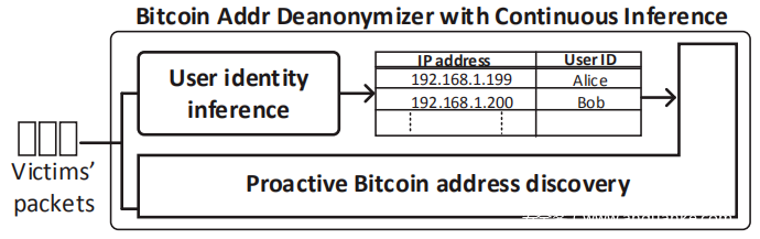 该模块包含两个主要功能:第一项功能是通过分析加密的Wi-Fi呼叫IPSec数据包来推断用户智能手机的IP地址,其Wi Fi呼叫事件和事件时间戳。攻击者可以通过分析Wi-Fi呼叫的IPSec数据包来识别Wi-Fi呼叫用户的呼叫事件(例如,拨打电话,接听电话或通话)。具体来说,通过分析Wi-Fi用户的IPSec数据包,攻击者可以准确地知道特定IP地址的所有者通过Wi-Fi呼叫服务进行通话的时间(呼叫开始的时间和呼叫结束的时间)。第二项功能是使用监控摄像头记录用户的动作,发现Wi-Fi呼叫开始和结束的时间,以及通过面部识别技术和在线反向图像搜索引擎(即查找人的姓名)来识别其用户身份通过提供照片)。通过关联第一个功能提供的Wi-Fi通话开始和结束的时间,能够推断出IP地址(例如192.168.1.75↔Alice)的用户身份。输出结果IP地址,用户身份将发送到比特币地址发现模块。