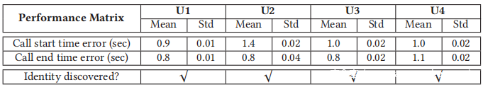 1)结果表明,基于Wi-Fi呼叫的用户身份推断模块可以识别五个实验运行中四个参与者的用户身份(如上表所示)。但是,还观察到呼叫开始/结束时间的平均误差约为1.5秒(即,基于视频的估计时间与Wi-Fi呼叫推断时间之间的误差)。这意味着如果多个用户拨打并结束其通话,以1.5秒的间隔通话,当前的模型可能无法准确识别用户身份。然而,可以通过向用户身份推断模块提供更多的呼叫统计信息(例如,用户在呼叫中保持沉默多长时间)来解决该问题。